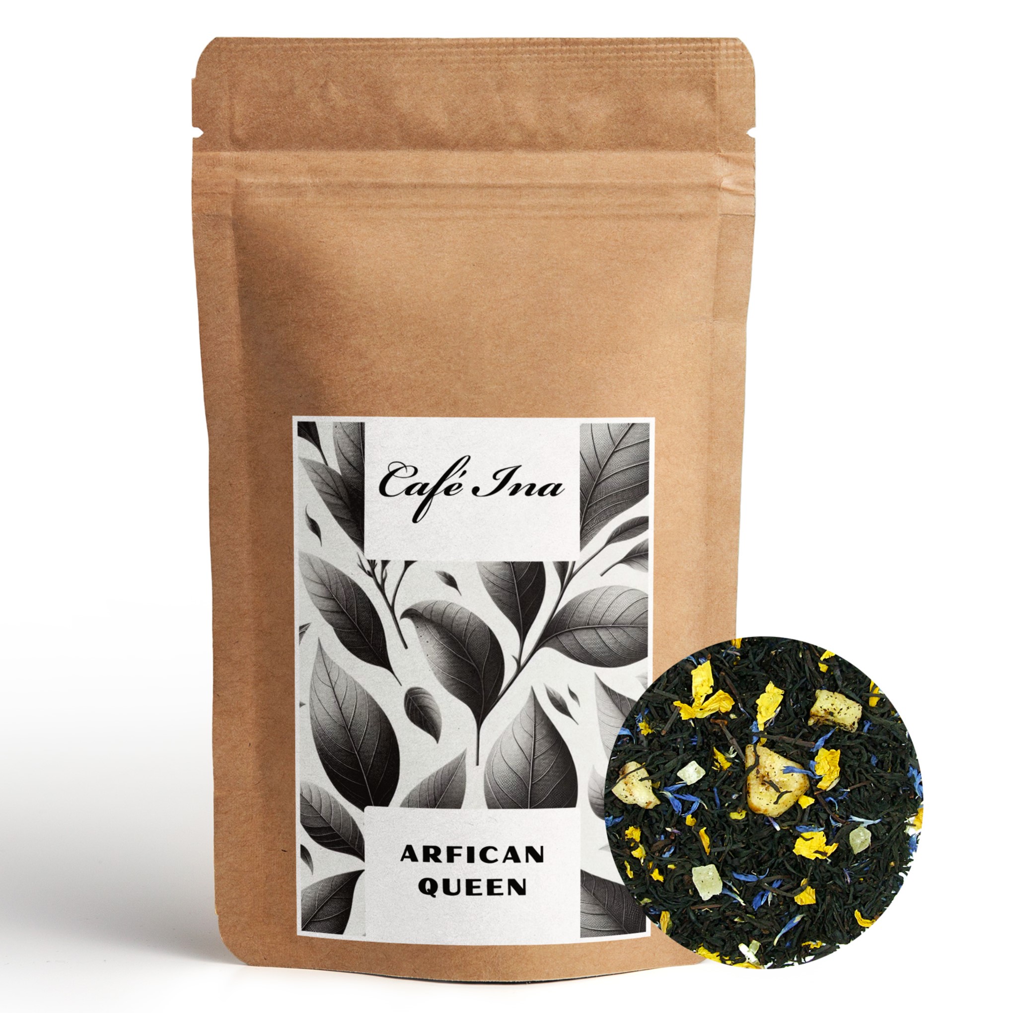 Herbata czarna African Queen to połączenie Ceylon BOP1 z dodatkiem owoców ananasa, banana, słonecznika oraz kwiatu bławatka. African Queen to herbata o wyjątkowym smaku i aromacie. Dzięki zastosowaniu egzotycznych owoców cierpkość czarnej herbaty została przełamana. Słodki ananas i banan świetnie komponują się z wyrazistą herbatą Ceylon BOP1. Herbata o delikatnym słodko- cytrusowym aromacie.