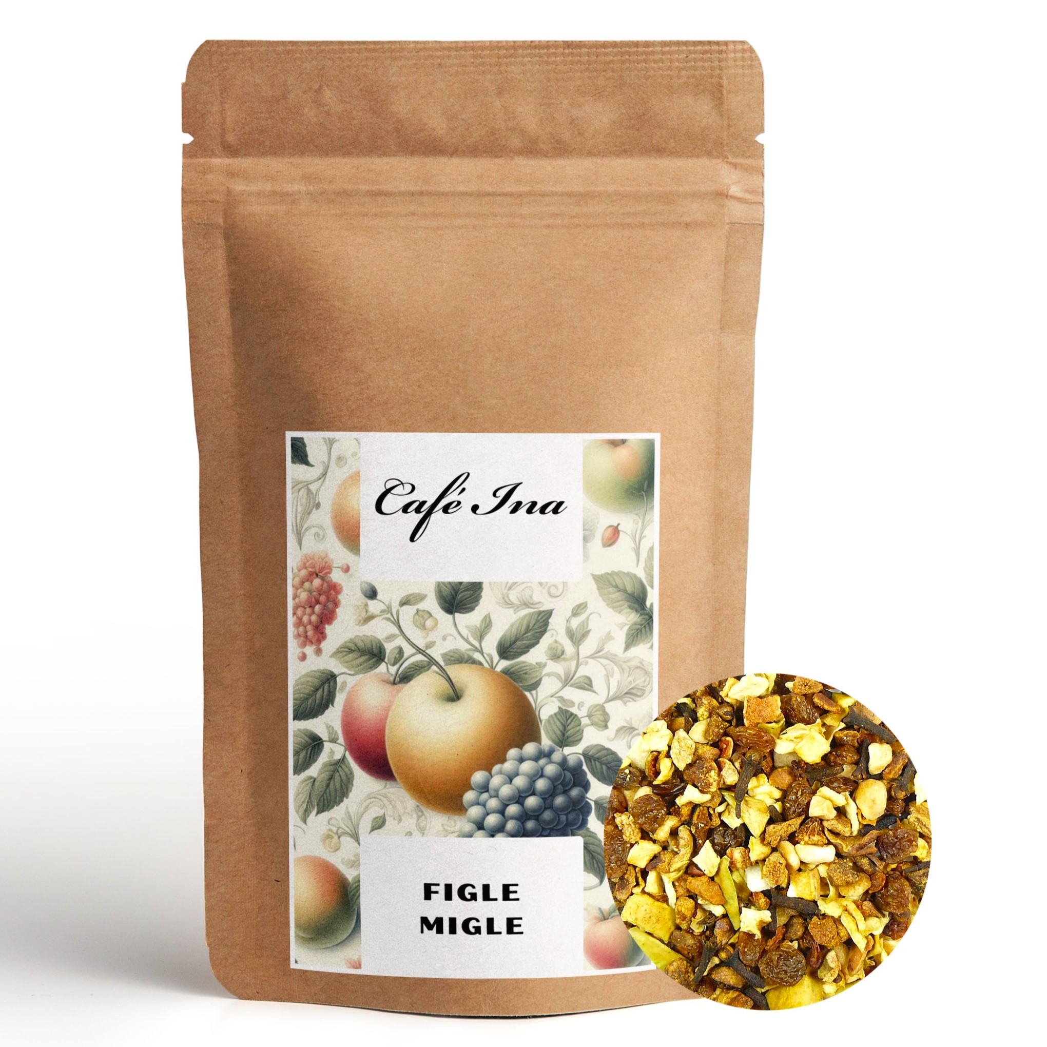 Figle Migle to mieszanka owoców składająca się z kawałków gruszki, rodzynek, jabłka oraz goździka. Herbata Figle Migle nie zawiera hibiskusa. Mieszanka owocowa charakteryzuje się łagodnym, słodkawym smakiem, który zachwyci wszystkich. Mieszankę nie tylko możemy zaparzyć i wypić napar ale również możemy Figle Migle potraktować jako przekąskę z suszonych owoców. Napar posiada piękny, delikatny jasno żółty kolor.
