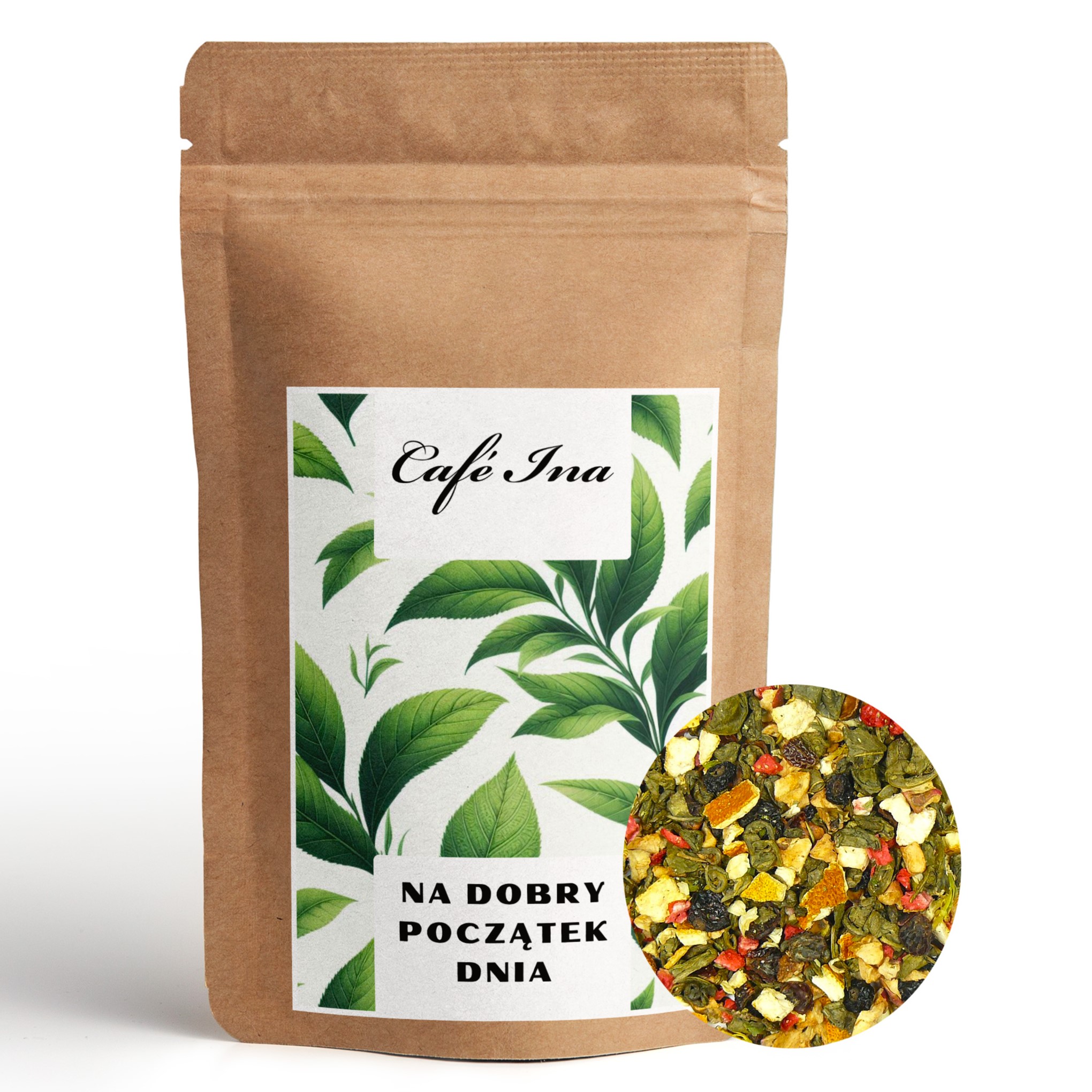 Herbata Zielona Na dobry początek dnia to Ceylon OPA z dodatkiem gruszki, jabłka, pomarańczy, porzeczki, skórki róży, bzu, jaśminu, liści brzozy. Na dobry Początek Dnia to herbata wyjątkowa ze względu na swoje właściwości. Mieszanka skomponowana według Feng shui i Ajurweda. Herbata zmniejsza napięcia psychiczne oraz pomaga w leczeniu migren. Jeżeli szukacie nowego wymiaru zielonej herbaty to Na dobry początek dnia spełni wasze oczekiwania. Niezwykle bogata mieszanka idealnie dobranych składników Wszystkich przyprawi o zachwyt.