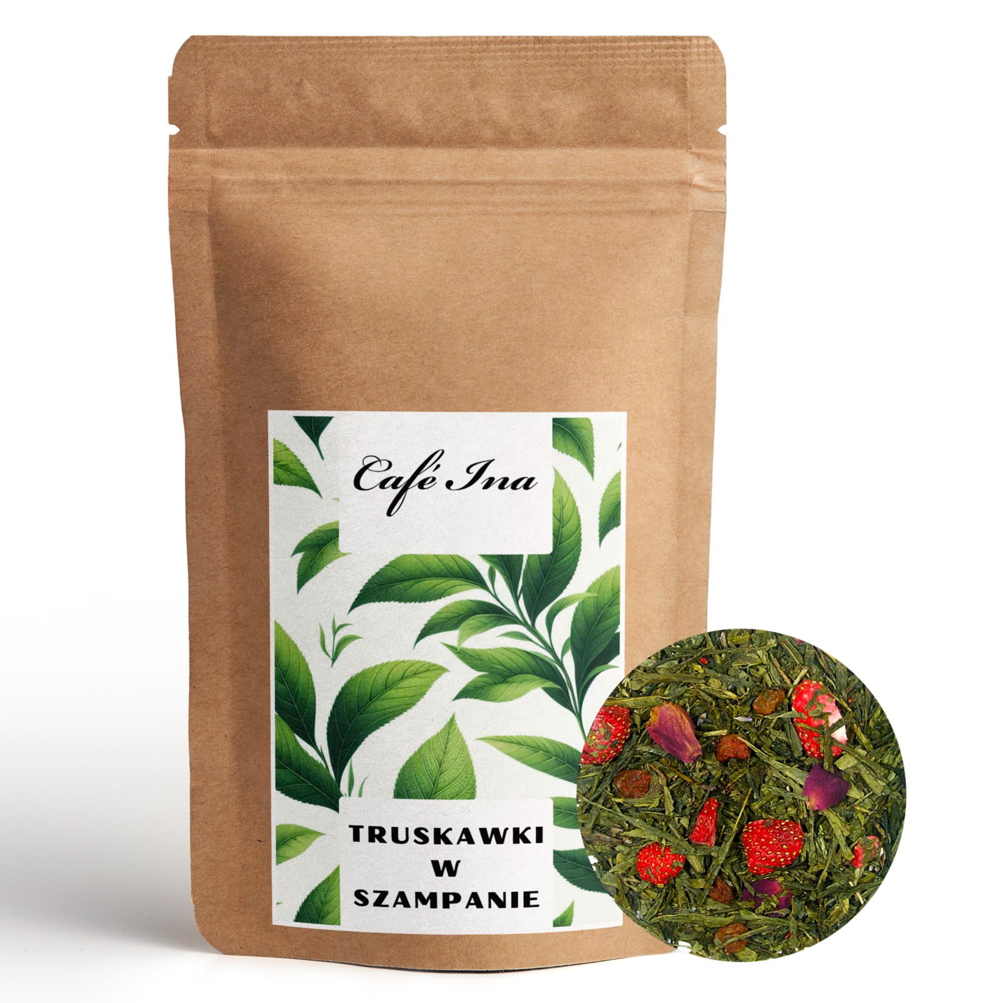 Herbata Zielona Truskawki w szampanie to wysokiej klasy zielona herbata o delikatnym smaku i aromacie. Ta niezwykła herbata to połączenie senchy china z dużymi kawałkami liofilizowanych truskawek, rodzynek oraz płatków róży z dodatkiem aromatu szampana. Ten wyskokowy napar zachwycie każdego miłośnika zielonej herbaty!