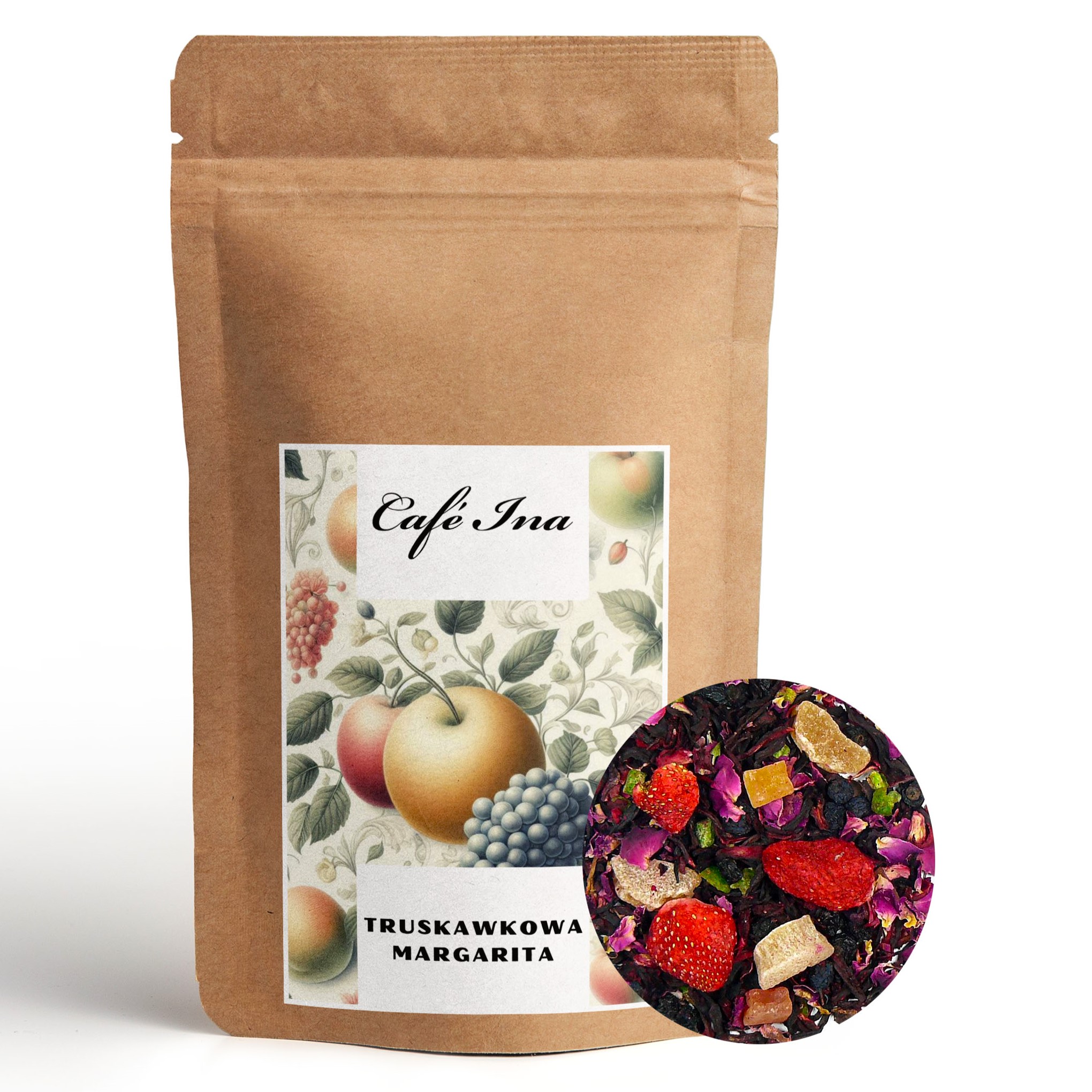 Herbata Owocowa Truskawkowa Margarita to niezwykle owocowa kompozycja. Znajdziemy w niej nie tylko truskawki ale i ananasa, aronię, czarną porzeczkę, cytrynę, papaję oraz płatki róży. Herbata Truskawkowa Margarita cechuje się wyrazistym smakiem z dominującą kwaskowatością. Bardzo bogata mieszkanka owoców o wyraźnym aromacie i smaku.
